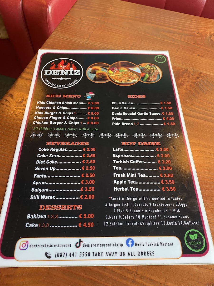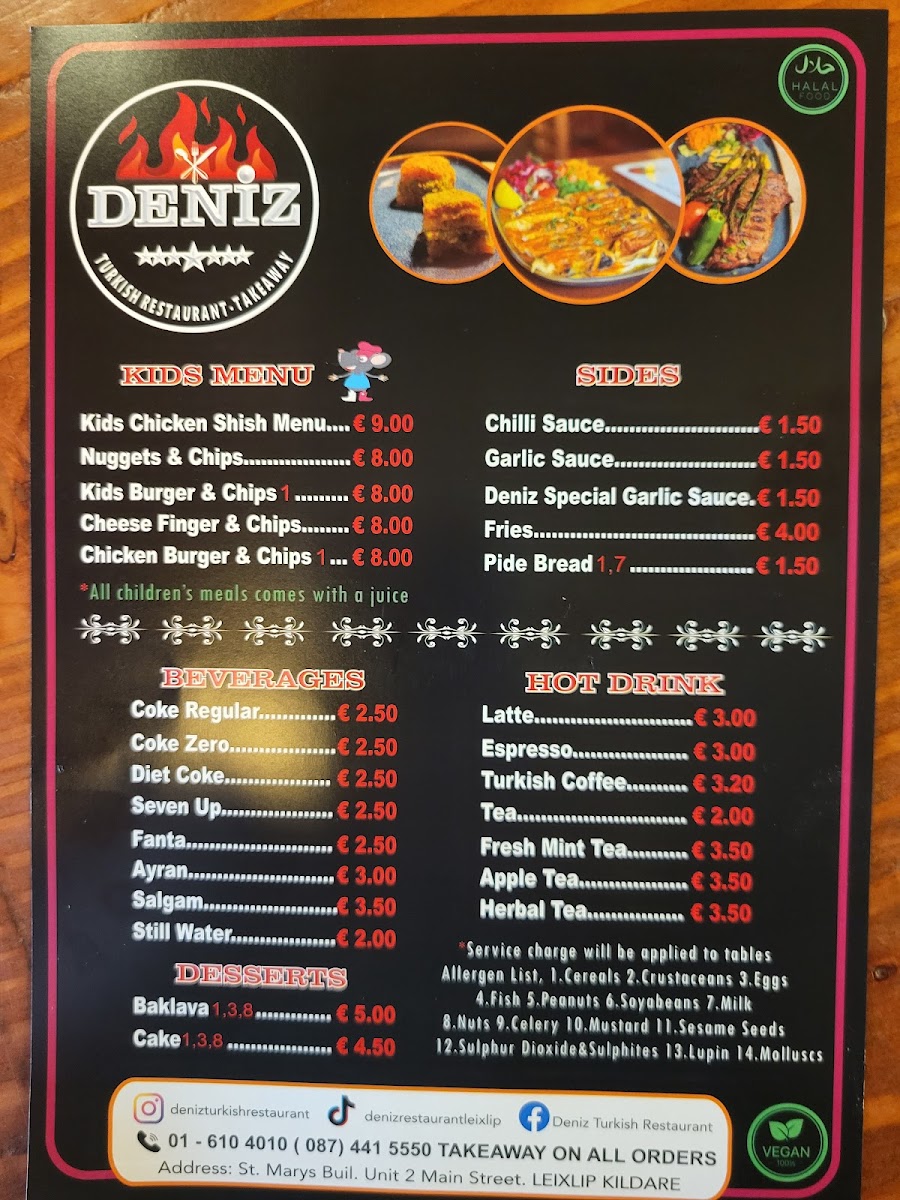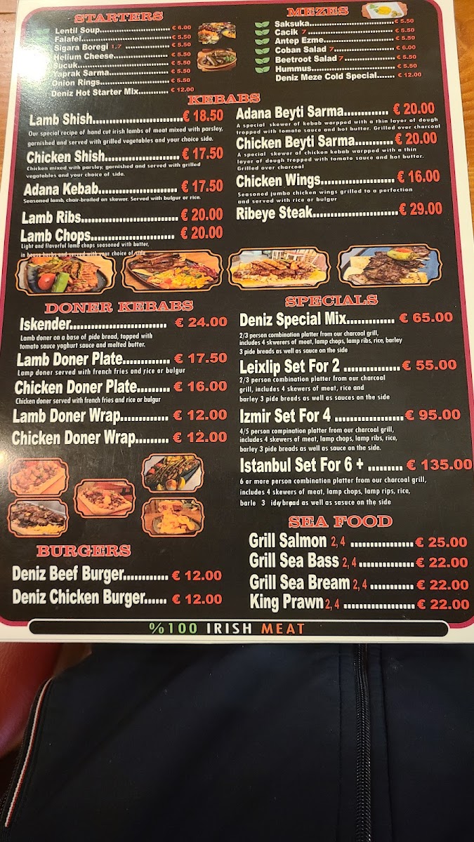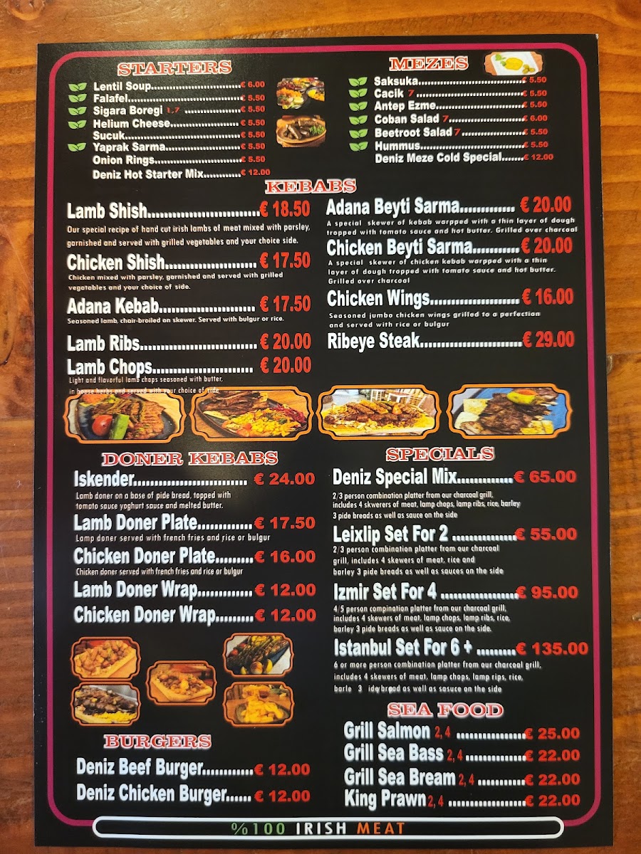 Welcome to Deniz Turkish Restaurant in Leixlip, a culinary gem that captures the essence of Turkish flavors. The menu features an array of tantalizing starters such as lentil soup and falafel, each priced at just €5. Flavors come alive with the Deniz Hot Starter Mix for a delightful communal experience at €15.